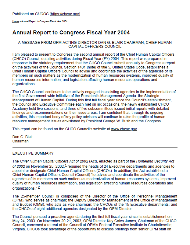 The Chief Human Capital Officers (CHCO) Council submits an Annual Report to Congress as required by the Homeland Security Act of 2002. These reports highlight the Council’s efforts to modernize federal human capital policies, strengthen the workforce, and advance initiatives that support agency missions. Each year’s report reflects progress, priorities, and collaboration across government to ensure a high-performing and skilled federal workforce.